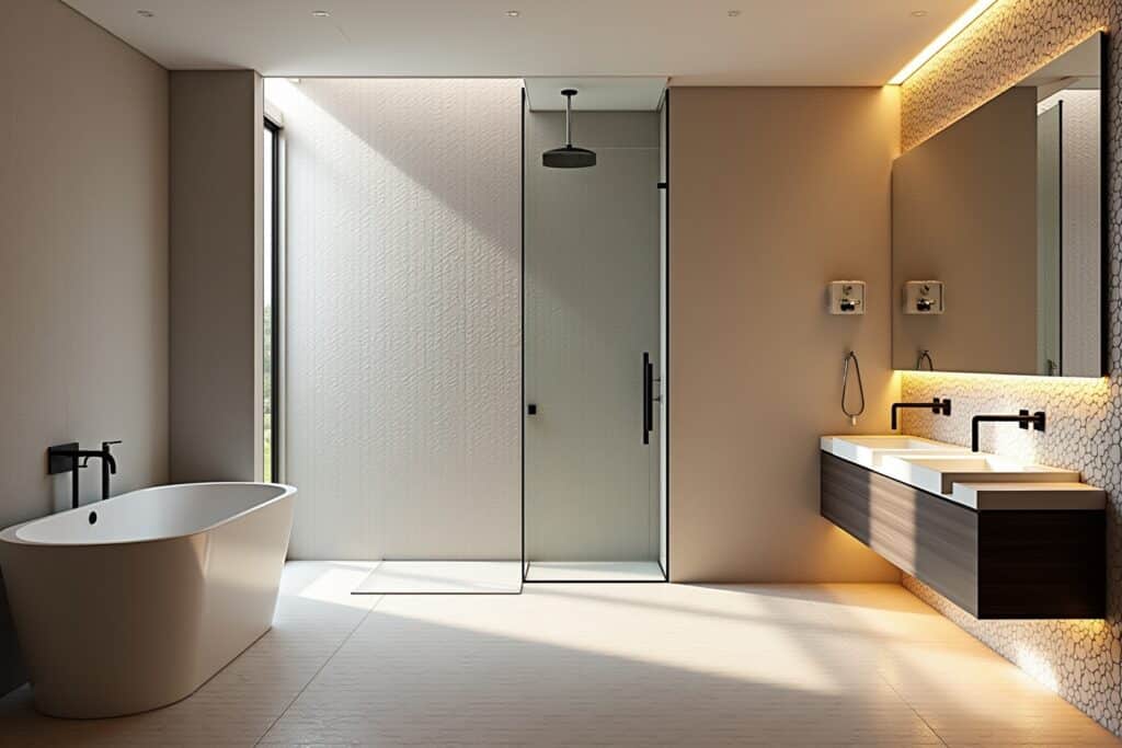 | Duschwand/-boden | Glas-, Naturstein-, Betonoptik-, 3D-Mosaik | Luxuriös, Spa-artig, modern, rau | Hohe Fugenanteile erfordern gute Versiegelung; rutschfeste Oberflächen für Boden |