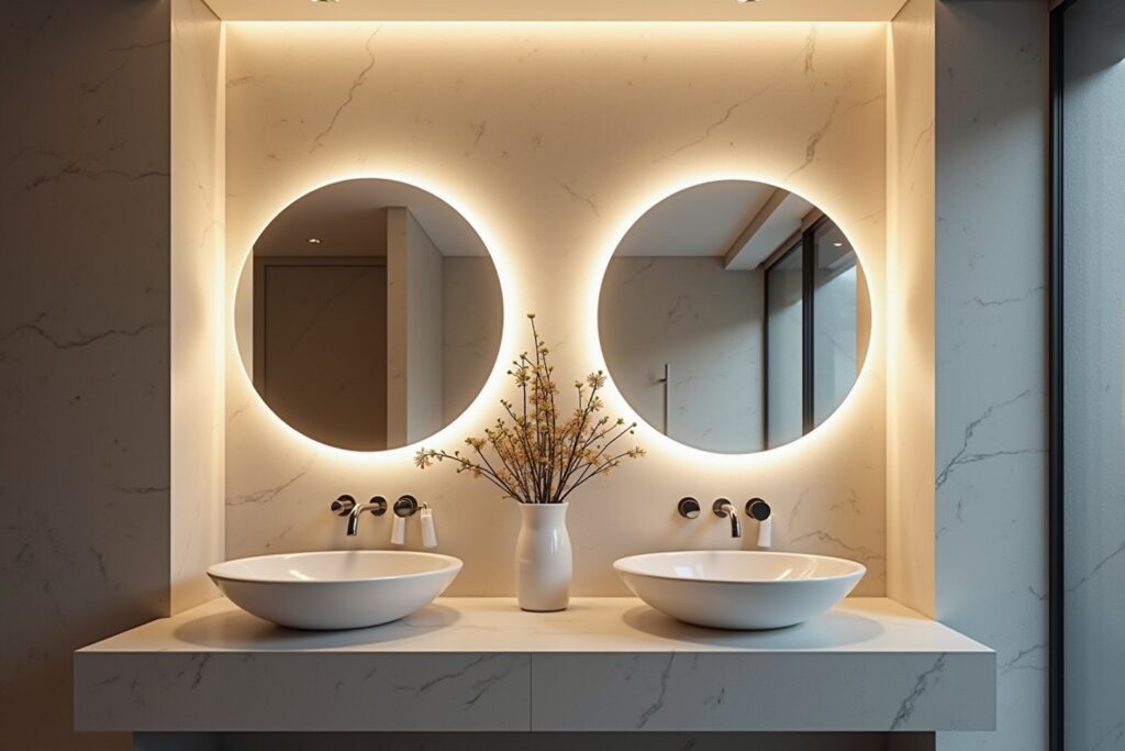 - 8. Der runde Spiegel mit hinterleuchtetem Rand: Eine elegante und moderne Wahl. Ein runder Spiegel mit einer diffusen Hintergrundbeleuchtung, die den Rand sanft zum Leuchten bringt, schafft eine weiche und einladende Atmosphäre. Diese Form passt besonders gut zu organischen und skulpturalen Baddesigns.
